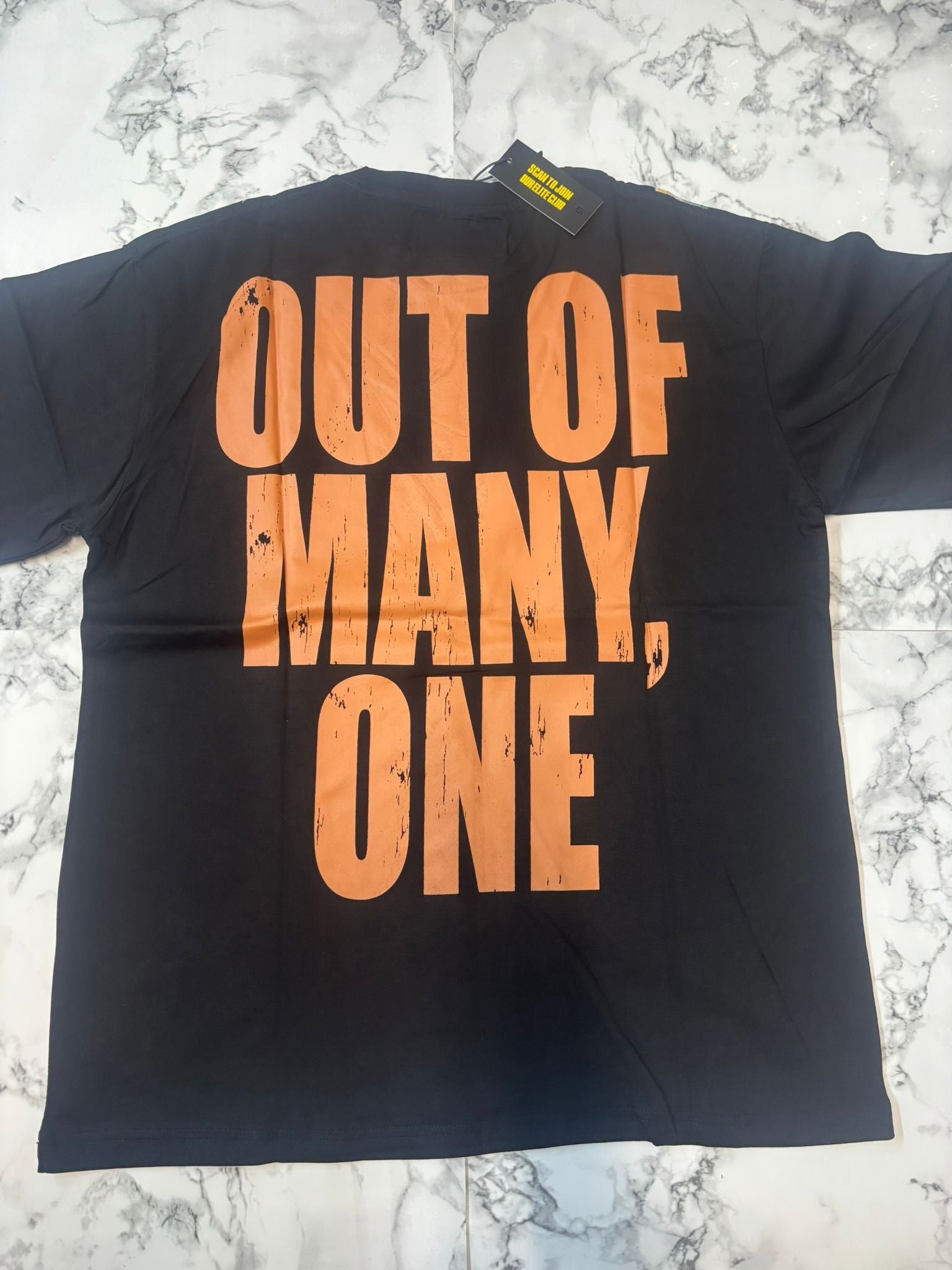 - Diseño trasero: Texto grande “OUT OF MANY, ONE”