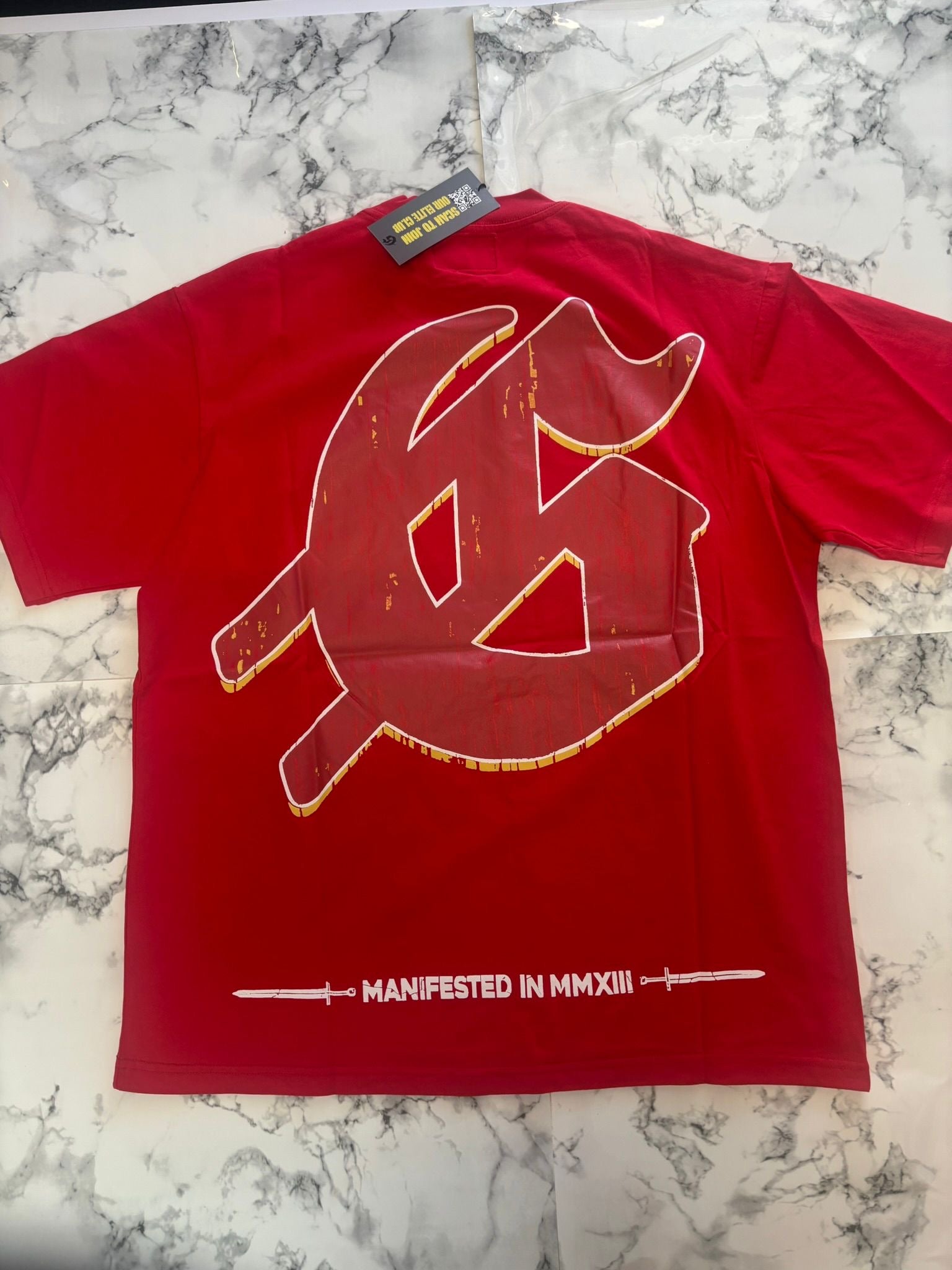 Diseño impactante y lleno de presencia. Esta camisa Godspeed Oversized XL en color rojo intenso presenta un gráfico frontal dominante de dos dobermans vigilantes bajo una luna llena, creando un look poderoso y agresivo que se siente premium y callejero.